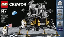 This advanced LEGO® set features a detailed replica of the Eagle lunar lander with separate ascent and descent stages, plus a depiction of the lunar surface with crater, footprints and a U.S. flag.