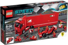 Drive the Scuderia Ferrari team and F14 T race car to the circuit in the fully-equipped Scuderia Ferrari truck. Open up the roof of the cabin to place the truck driver at the steering wheel with a team crew member alongside. Detach the trailer and turn the lever to release the standing feet. Fold out the roof and sides to access the awesome race car, scooter and array of cool equipment including a complete tool set and computer screens. Lower the rear hatch and activate the launch function to push the F14 T down the ramp. Then challenge your friends and their LEGO® Speed Champions cars to thrilling races! Includes 6 minifigures with assorted accessories: a driver, team truck driver and 4 team crew members.