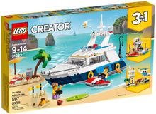 Head for sunny shores with the LEGO® Creator 3in1 31083 Cruising Adventures set, featuring a luxury yacht with a cool blue and white color scheme and an array of realistic details, including a radar and an accessible cabin with toilet. The yacht also features 4 hull-mounted life preservers and comes with a water scooter, surfboard, fishing rod, palm tree and a sandcastle. Rebuild this set for whole new adventures featuring a cozy Beach House with a dock and sailboat, or a Helicopter with a landing pad and control tower. Includes 3 minifigures, all ready for fun and adventure.