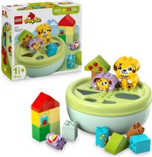 Give pooch-loving preschoolers two ways to play with the Shape Sorter: Puppy House (10441) toy. This fine motor skills toy for toddlers aged 18 months and up introduces joyful learning about shapes and problem solving as preschoolers use the bricks to build a place for their pups to play, then drop the shapes through the holes in the lid.