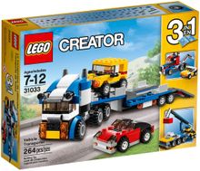 Climb aboard the awesome 3-in-1 Vehicle Transporter! This powerful haulage rig features a cool blue and white color scheme, tilting cab that reveals a detailed engine, folding trailer ramp for easy vehicle access, large exhaust stacks, warning beacons and roof spotlights. Includes 2 vehicles, an off-roader and a sports car. Fold down the ramps and drive the vehicles onto the huge articulated trailer. Then start the powerful engine and head for the open road! Rebuilds into a tow truck or a mobilecrane—that’s a cool 3-in-1!