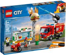 Defend the local burger shop with the awesome LEGO® City 60214 Burger Bar Fire Rescue set, featuring a burger bar with sign and toppling fire elements, sliding service window and trash can. This fun set also features a fire truck with minifigure cab, 2 storage compartments, rotating back end and new-for-January-2019 directional pump with ‘water jet' function. There's also a motorbike with room for a fire extinguisher, new-for-January-2019 fire axe and 3 minifigures.