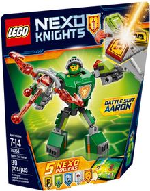Become a bigger hero with the LEGO® NEXO KNIGHTS™ Battle Suit Aaron play set, featuring a buildable battle suit with posable limbs, minifigure cockpit, Blazer Bow with spring-loaded shooters, giant fist and a Combo NEXO POWER shield. Includes five scannable shields for NEXO POWERS that provide unique battle skills in the digital game and a new-for-spring-2017 Aaron minifigure.