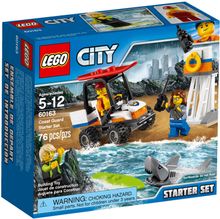Join the crew of the LEGO® City coast guard as they protect the beach with the Coast Guard Starter Set, featuring a beach tower with stairs and viewing platform, beach buggy with opening roll cage, room for 2 minifigures and space for the 2-minifigure surfboard on the roof, binoculars, 2 walkie-talkies and a small surfboard. Includes 3 minifigures and a shark figure.