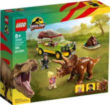 Toy dinosaur and 2 minifigures – A posable Triceratops figure, plus Ian Malcolm and Dr. Ellie Sattler with a shovel element to scoop the hidden toxic berry element from the buildable dinosaur poop