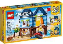 Enjoy summer adventures with this sunny beach house, featuring a blue-striped color scheme, two large windows with green-and-white awnings and yellow door, plus a detailed interior with an armchair, fish tank and a ceiling fan, and exterior details including a hammock, palm tree and a beach and ocean area. Also includes a buildable water scooter. Rebuild this 3-in-1 LEGO® Creator model into a Beachside Shop or a Boatside Harbor. Includes two minifigures, plus a buildable sea turtle and seagull.