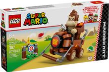 Join Donkey Kong for Mario Kart™ racing adventures with this Nintendo® collectible toy playset for kids (72033). A fantastic LEGO® Super Mario™ birthday gift idea for boys, girls and gamers aged 8 and up, the set features a brick-built DK Jumbo toy vehicle, Donkey Kong toy figure and a target, plus a Banana element with face decoration. Help Donkey Kong drive the DK Jumbo and hit the target by launching shells from the kart to knock the Banana off the top.