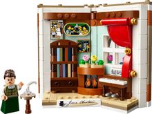 The detailed display model features a Jane Austen minifigure in her lovely home, which contains a small writing table with a quill, a piano with sheet music, a bookshelf, flowers, a cosy fireplace and paintings on the wall showing scenes from film adaptations of her books. A nameplate is attached to a sturdy base and, from the rear, the display model looks like a book.