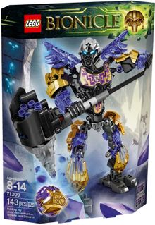 Onua Uniter of Earth features a BIONICLE® head with mask pop-off trigger, Unity Mask of Earth, armor chest plate with rune decorations, unity piece to attach creatures and posable joints.